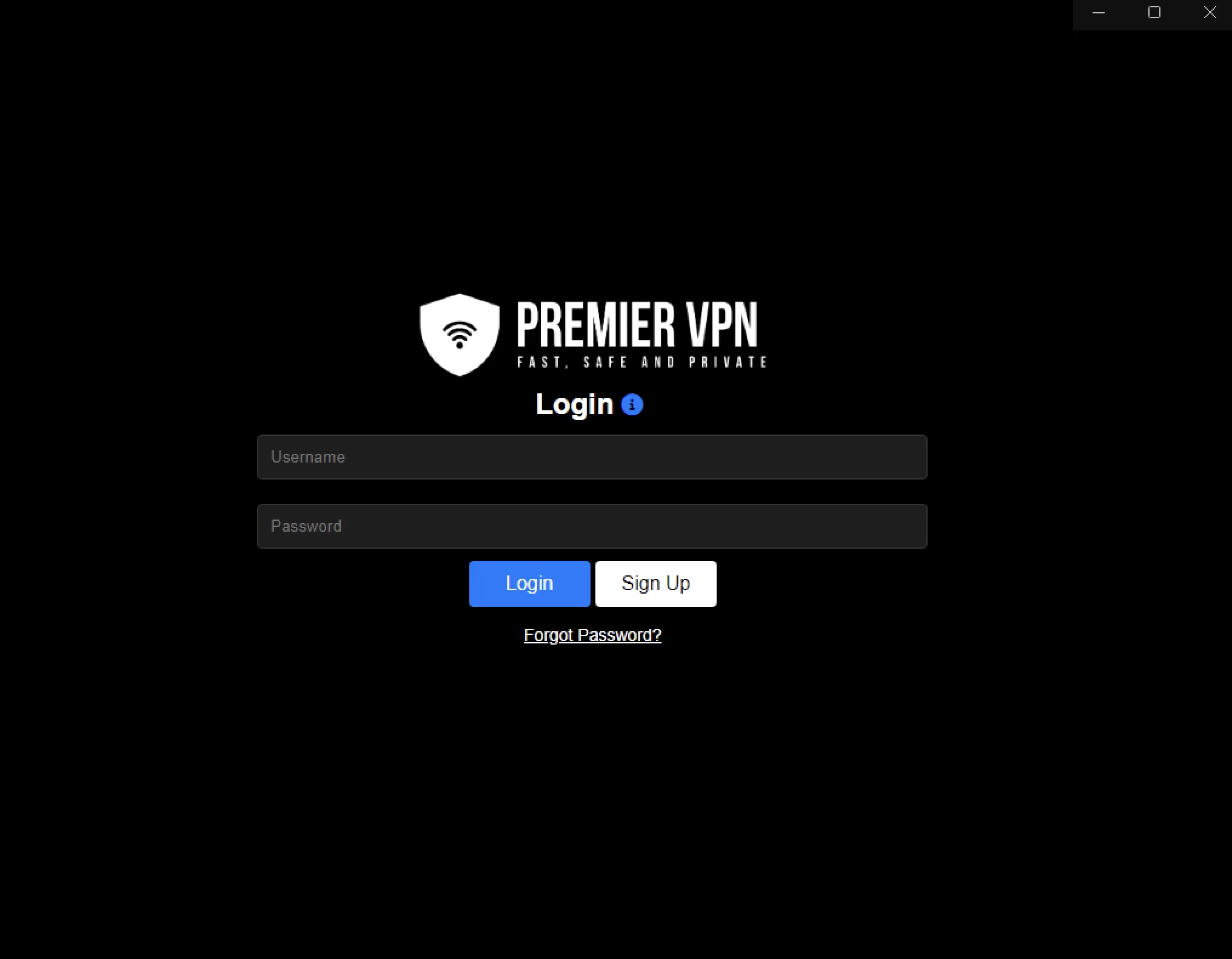 Atidarę programėlę ir prisijungimo lange, prisijunkite prie „PremierVPN Windows“ programėlės naudodami prisijungimo duomenis, atsiųstus aktyvinimo el. laiške. Vartotojo vardas paprastai yra jūsų el. pašto adresas.